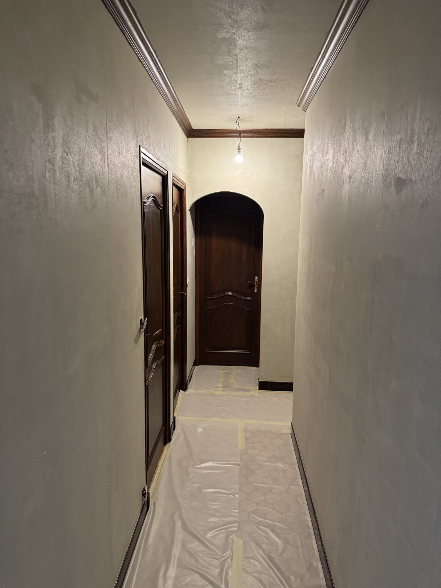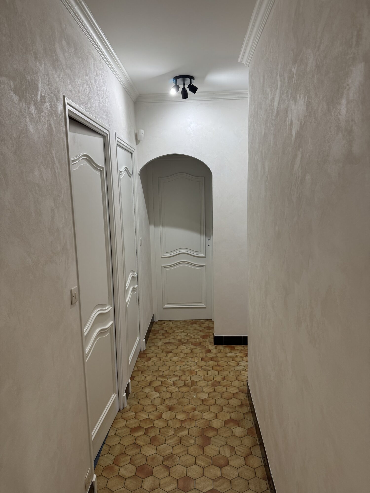 Pour redonner de la clarté et de la douceur à ce couloir, nous avons appliqué une peinture décorative blanc perle.